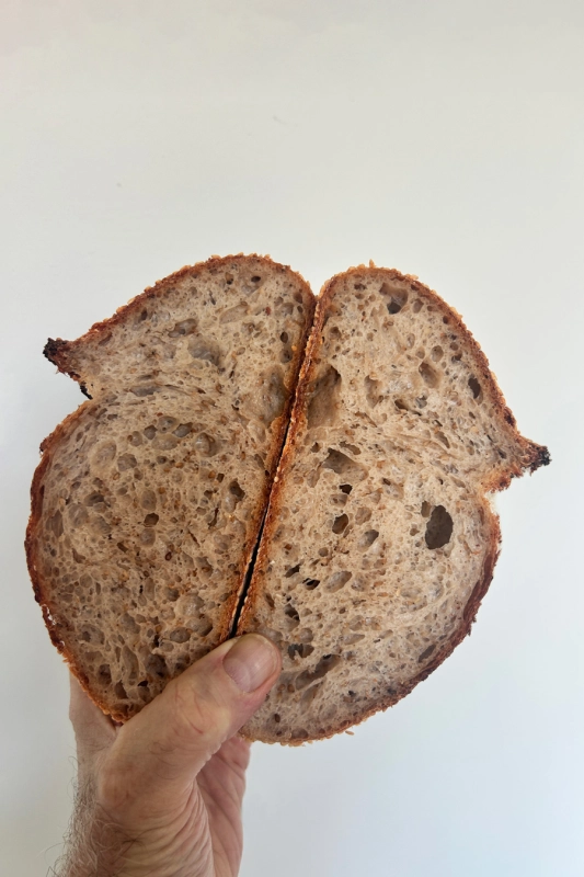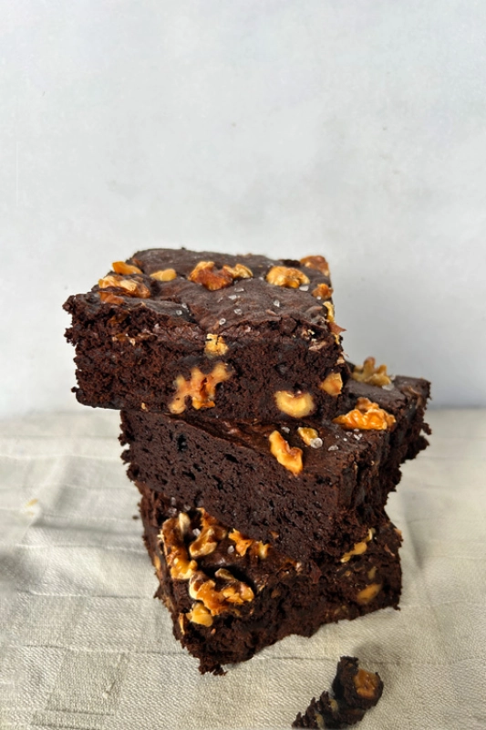 Mijn Walnoot Brownies zijn diepdonkere smaakbommetjes van pure chocolade (80%) met een vleugje espresso voor een subtiele kick. De geroosterde walnoten geven een volle, aardse bite. Met precies de goede substantie — tussen cake en fudge in — blijven ze rijk, maar nooit té zwaar. Zo’n 135 gram puur genot.